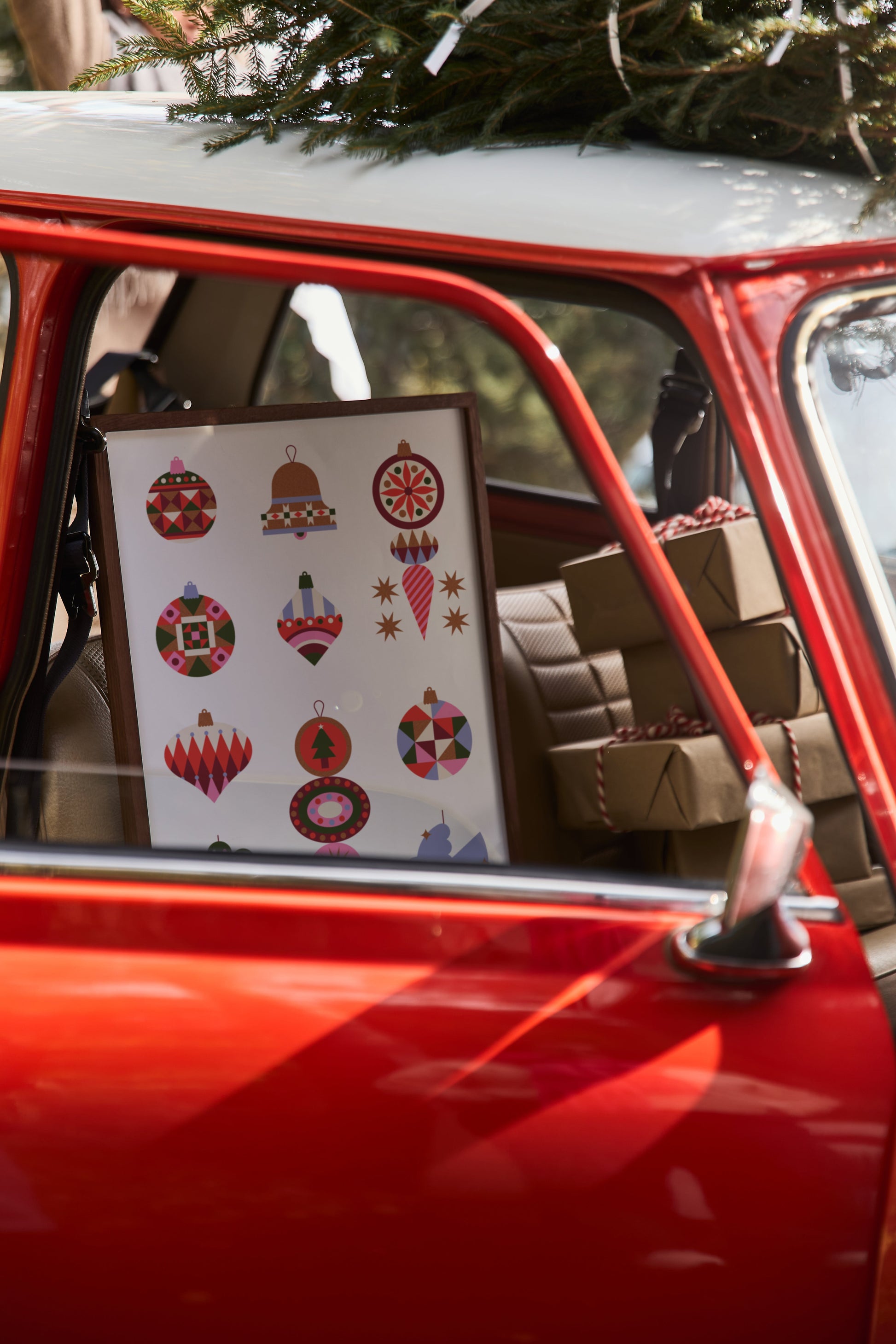 This version of the ornament collage offers a lighter take on the holiday theme, with a soft cream background that allows the colors of the ornaments to pop. Each ornament features a different geometric design, with bright reds, greens, pinks, and blues creating a harmonious color scheme. The ornaments are arranged in a clean, balanced grid.